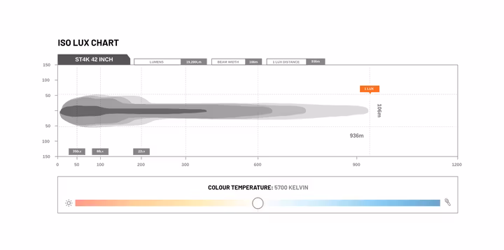 Utrustad med 80 av OSRAMs® finaste OSLON® LED med en kombination av 12 Flood + 56 Spot + 12 Flood reflektorer bildas en anmärkningsvärt kraftig ljusstråle som skjuter ut den breda strålen ut i 50° och spot i 5,8° hela vägen till svindlande 1 lux vid 936m.