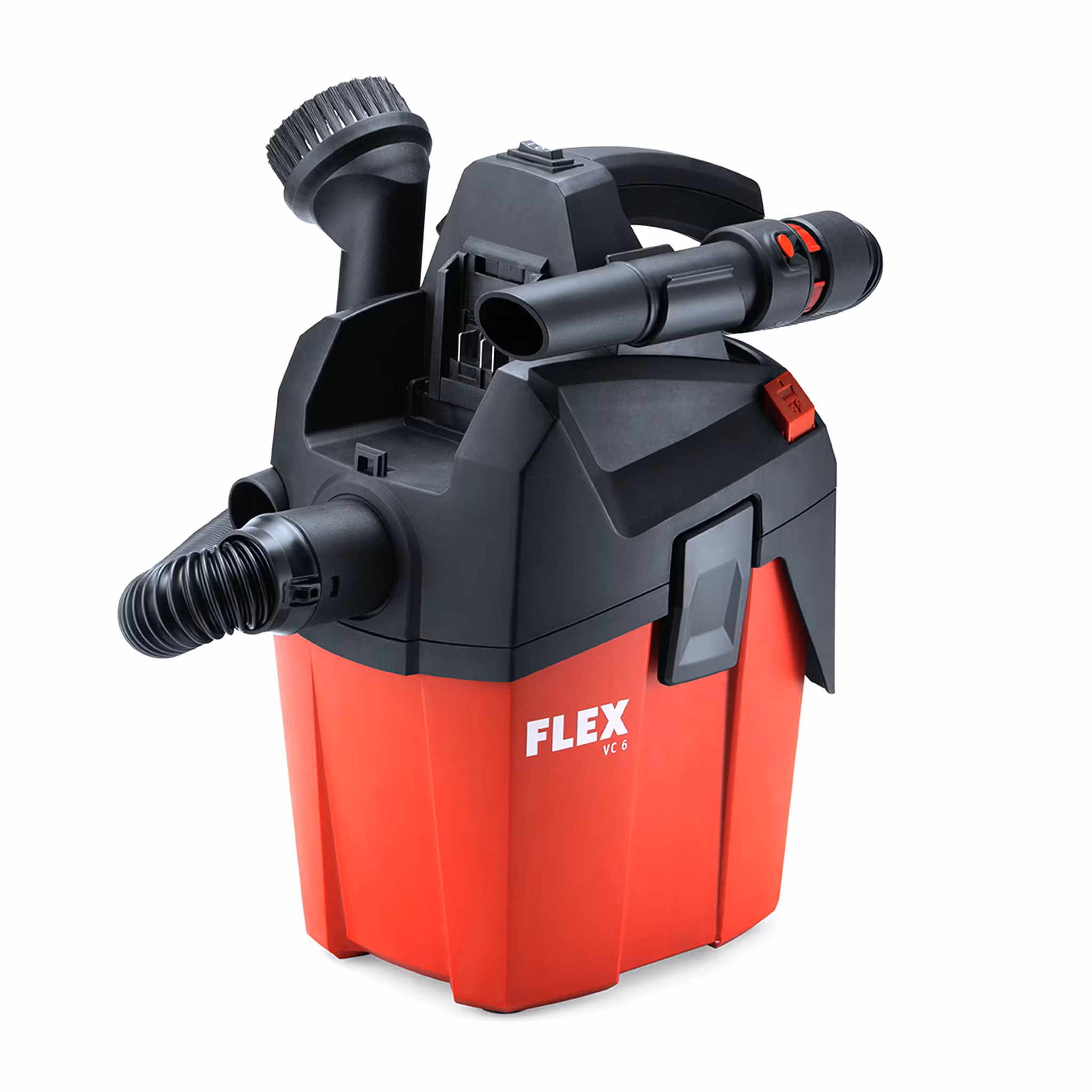 Den mycket lätta och kompakta strukturen och den ergonomiska designen gör att dammsugaren är bekväm och enkel att använda. Dessutom kan tillbehören fästas direkt på dammsugaren, så att de är med under arbetet. Längden på den medföljande sugslangen är 50 cm, men slangen kan förlängas upp till 250 cm, vilket räcker för ännu mer krävande föremål. Dessutom har dammsugaren en bekväm filterrengöring, som kan användas för att ta bort damm som samlats i filtret. ECO-funktionen gör det möjligt att förlänga batteritiden var 30:e minut (med max. 2000 Pa sugeffekt). Detta är särskilt praktiskt när det inte finns något laddningsalternativ. VC 6 L MC 18.0 är kompatibel med alla Flex 18V batterier.